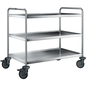 Serveerwagen van roestvrij staal met holle rubberen wielen 4 zwenkwielen ø125 mm waarvan 2 met rem Afmetingen van de plateaus: 3 plateaus 1000 x 600 mm max. belasting per plateau: 80 kg Vrije hoogte tussen de plateaus: 275 mm Draagvermogen: 120 kg