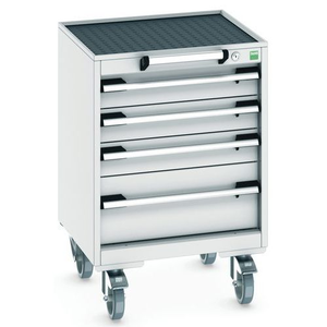 Verrijdbare werkplaatsladekast Cubio, Totale hoogte: 780 mm, Aantal laden: 4, Totale breedte: 525 mm, Totale diepte: 525 mm, Kleur: Lichtgrijs, Totale hoogte lade: 3 x 100 ; 1 x 200 mm, Kleur ombouw: Lichtgrijs, Max. belasting per lade: 50 kg, Max. belasting: 300 kg, RAL: 7035, Zwenkwiel Ø: 125 mm, Special Covid-19: nee, Aantal legborden: 0, Aantal zwenkwielen: 4, Recyclebare verpakking: Ja - 100%, Gerecyclede verpakkingen: 93 %, Gewicht: 55.9 kg, Type nr.: 40402109.16V, Lade kleur: Lichtgrijs