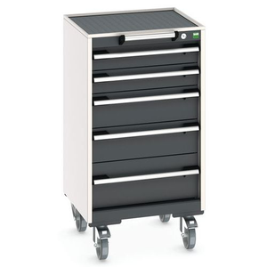 Verrijdbare werkplaatsladekast Cubio, Totale hoogte: 980 mm, Aantal laden: 5, Totale breedte: 525 mm, Totale diepte: 525 mm, Kleur: Antraciet, Totale hoogte lade: 2 x 100 ; 2 x 150 ; 1 x 200 mm, Kleur ombouw: Lichtgrijs, Max. belasting per lade: 50 kg, Max. belasting: 300 kg, RAL: 7016, Zwenkwiel Ø: 125 mm, Special Covid-19: nee, Aantal legborden: 0, Aantal zwenkwielen: 4, Recyclebare verpakking: Ja - 100%, Gerecyclede verpakkingen: 93 %, Gewicht: 67.8 kg, Type nr.: 40402019.19V, Lade kleur: Antraciet