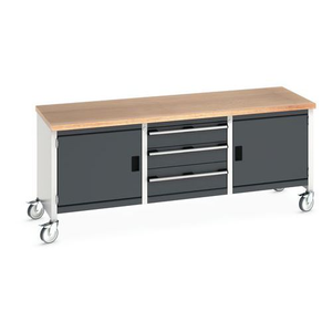 Verrijdbaar werkplaatsbank monobloc Cubio, Totale hoogte: 840 mm, Aantal laden: 3, Totale breedte: 2000 mm, Totale diepte: 750 mm, Kleur: Antraciet, Deurhoogte: 475 mm, Dikte tafelblad: 40 mm, Totale hoogte lade: 2 x 150 ; 1 x 200 mm, Kleur ombouw: Lichtgrijs, Max. belasting per lade: 75 kg, Max. belasting: 300 kg, Aantal deuren: 2, RAL: 7016, Zwenkwiel Ø: 125 mm, Max. belasting per legbord: 100 kg, Special Covid-19: nee, Aantal legborden: 2, Aantal zwenkwielen: 4, Recyclebare verpakking: Ja - 100%, Gerecyclede verpakkingen: 93 %, Werkbank blad materiaal: Beuk multiplex, Gewicht: 159 kg, Type nr.: 41002124.19V, Lade kleur: Antraciet, Kleur deur: Antraciet