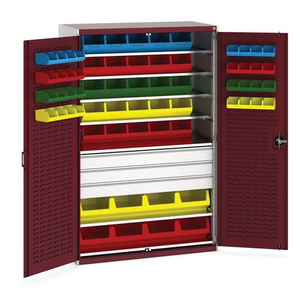 Opbergkast met bakken Cubio SMF-10620-1.18, Totale hoogte: 2000 mm, Totale breedte: 1300 mm, Totale diepte: 650 mm, Kleur ombouw: Lichtgrijs Rood, Kleur deur: Rood, Materiaal: Staal, Verrijdbaar: nee, Recyclebare verpakking: Ja - 100%, Gerecyclede verpakkingen: 93 %, Type: Werkplaats kast, Coating: Epoxy