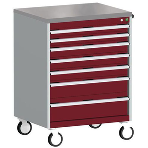 Verrijdbare ladekast Cubio SLR-869-7.1, Totale hoogte: 1090 mm, Aantal laden: 7, Totale breedte: 800 mm, Totale diepte: 650 mm, Kleur: Rood, Type: Ladekast, Totale hoogte lade: 2 x 75 ; 3 x 100 ; 1 x 150 ; 1 x 200 mm, Kleur ombouw: Lichtgrijs, Max. belasting per lade: 50 kg, Max. belasting: 600 kg, RAL: 3004, Zwenkwiel Ø: 125 mm, Special Covid-19: nee, Aantal legborden: 0, Aantal zwenkwielen: 4, Recyclebare verpakking: Ja - 100%, Gerecyclede verpakkingen: 93 %, Gewicht: 119.4 kg, Type nr.: 40402162.24V, Lade kleur: Rood