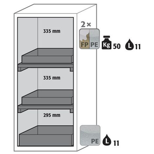 Veilige opslag, voldoet aan de geldende regelgeving voor gevaarlijke, ontvlambare producten in werkruimtes Robuust en duurzaam: Stevige constructie aan de buitenzijde van brandwerende platen met een coating van melaminehars 3 bevestigingsscharnieren per deur volledig sluitmechanisme en beveiligingselementen ter bescherming tegen corrosie, gemonteerd buiten de opslagruimte hoogwaardige deur, krasbestendig, met gestructureerd oppervlak met epoxy-coating Ergonomisch: de deur blijft in de stand staan bij het openen, automatische sluiting in geval van brand Gecontroleerd gebruik: vergrendelbare deur, compatibel met centrale vergrendeling Eenvoudig transport: geïntegreerde transportsokkel, eenvoudig afgewerkte plint of plint met 4 nivelleringsvoeten optioneel beschikbaar Beluchting en ontluchting: ingebouwd beluchtings- en ventilatiesysteem voor aansluiting (diameter 75 mm) op een technisch luchtafvoersysteem Getest en gecertificeerd conform de Amerikaanse norm FM 6050