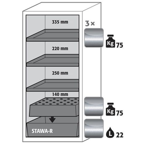 Veilige opslag, voldoet aan de geldende regelgeving voor gevaarlijke, ontvlambare producten in werkruimtes Functie/constructie: Robuust en duurzaam: stevige stalen constructie aan de buitenkant met epoxy-coating 3 bevestigingsscharnieren per deur, volledig sluitmechanisme en beveiligingselementen ter bescherming tegen corrosie, gemonteerd buiten de opslagruimte Comfortabel: automatisch deursluitsysteem, deuren kunnen in geopende stand worden gehouden. Veilige opslag van containers Altijd gesloten: automatisch deursluitsysteem (TSA) sluit de geblokkeerde deur na 60 seconde, geluidsalarm en visueel alarm voordat de deur sluit Gecontroleerd gebruik: vergrendelbare deur, compatibel met centrale vergrendeling Eenvoudige installatie: geïntegreerde verstelbare poten Beluchting en ontluchting: ingebouwd beluchtings- en ventilatiesysteem voor aansluiting (diameter 75 mm) op een technisch luchtafvoersysteem Let op: voor de technische ventilatie van de kast adviseren wij de ventilatiebox met geïntegreerde filtratie (zonder gaten in de muren te boren of afvoerleidingen naar buiten).