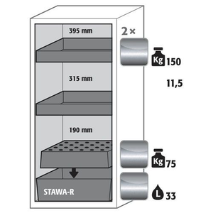 Veilige opslag, voldoet aan de geldende regelgeving voor gevaarlijke, ontvlambare producten in werkruimtes Functie/constructie: Robuust en duurzaam: stevige stalen constructie aan de buitenkant met epoxy-coating 3 bevestigingsscharnieren per deur, volledig sluitmechanisme en beveiligingselementen ter bescherming tegen corrosie, gemonteerd buiten de opslagruimte Comfortabel: automatisch deursluitsysteem, deuren kunnen in geopende stand worden gehouden. Veilige opslag van containers Altijd gesloten: automatisch deursluitsysteem (TSA) sluit de geblokkeerde deur na 60 seconde, geluidsalarm en visueel alarm voordat de deur sluit Gecontroleerd gebruik: vergrendelbare deur, compatibel met centrale vergrendeling Eenvoudige installatie: geïntegreerde verstelbare poten Beluchting en ontluchting: ingebouwd beluchtings- en ventilatiesysteem voor aansluiting (diameter 75 mm) op een technisch luchtafvoersysteem Let op: voor de technische ventilatie van de kast adviseren wij de ventilatiebox met geïntegreerde filtratie (zonder gaten in de muren te boren of afvoerleidingen naar buiten).