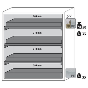 Veilige opslag, voldoet aan de geldende regelgeving voor gevaarlijke, ontvlambare producten in werkruimtes Robuust en duurzaam: Stevige constructie aan de buitenzijde van brandwerende platen met een coating van melaminehars 3 bevestigingsscharnieren per deur volledig sluitmechanisme en beveiligingselementen ter bescherming tegen corrosie, gemonteerd buiten de opslagruimte hoogwaardige deur, krasbestendig, met gestructureerd oppervlak met epoxy-coating Ergonomisch: de deur blijft in de stand staan bij het openen, automatische sluiting in geval van brand Gecontroleerd gebruik: vergrendelbare deur, compatibel met centrale vergrendeling Eenvoudig transport: geïntegreerde transportsokkel, eenvoudig afgewerkte plint of plint met 4 nivelleringsvoeten optioneel beschikbaar Beluchting en ontluchting: ingebouwd beluchtings- en ventilatiesysteem voor aansluiting (diameter 75 mm) op een technisch luchtafvoersysteem Getest en gecertificeerd conform de Amerikaanse norm FM 6050