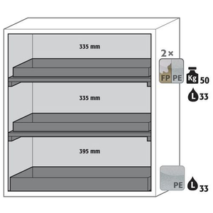 Veilige opslag, voldoet aan de geldende regelgeving voor gevaarlijke, ontvlambare producten in werkruimtes Robuust en duurzaam: Stevige constructie aan de buitenzijde van brandwerende platen met een coating van melaminehars 3 bevestigingsscharnieren per deur volledig sluitmechanisme en beveiligingselementen ter bescherming tegen corrosie, gemonteerd buiten de opslagruimte hoogwaardige deur, krasbestendig, met gestructureerd oppervlak met epoxy-coating Ergonomisch: de deur blijft in de stand staan bij het openen, automatische sluiting in geval van brand Gecontroleerd gebruik: vergrendelbare deur, compatibel met centrale vergrendeling Eenvoudig transport: geïntegreerde transportsokkel, eenvoudig afgewerkte plint of plint met 4 nivelleringsvoeten optioneel beschikbaar Beluchting en ontluchting: ingebouwd beluchtings- en ventilatiesysteem voor aansluiting (diameter 75 mm) op een technisch luchtafvoersysteem Getest en gecertificeerd conform de Amerikaanse norm FM 6050