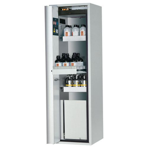 Veilige opslag van ontvlambare gevaarlijke stoffen in werkruimtes conform de wettelijke voorschriften, Functie - constructie: Robuust en duurzaam: stabiele buitenbehuizing van gepoedercoat fijn plaatstaal, 3-voudige deurophanging, volledig sluitmechaniek en veiligheidselementen ter bescherming tegen corrosie buiten de opslagruimte gemonteerd, Ruimtebesparende vouwdeur: kleine benodigde ruimte voor de kast bij geopende deur, Betrouwbaar en veilig: de deur klikt vast in de standaard gemonteerde deurvastzetinrichting voor het veilig plaatsen en uitnemen van emballage, Geen toegang voor onbevoegden: deur afsluitbaar met profielcilinder (geschikt voor centraal deursluitsysteem), Gemakkelijk te plaatsen: stelvoeten voor het compenseren van kleinere oneffenheden in de vloer (tot 10 mm), Be- en ontluchting: geïntegreerd beluchtings- en ventilatiesysteem voor aansluiting (NW 75) op een mechanische afzuiginstallatie Let op: voor de technische ventilatie van de kast adviseren wij de ventilatiebox met geïntegreerde filtratie (zonder gaten in de muren te boren of afvoerleidingen naar buiten).