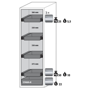 Veilige opslag van ontvlambare gevaarlijke stoffen in werkruimtes conform de wettelijke voorschriften, Functie - constructie: Robuust en duurzaam: stabiele buitenbehuizing van gepoedercoat fijn plaatstaal, 3-voudige deurophanging, volledig sluitmechaniek en veiligheidselementen ter bescherming tegen corrosie buiten de opslagruimte gemonteerd, Ruimtebesparende vouwdeur: kleine benodigde ruimte voor de kast bij geopende deur, Betrouwbaar en veilig: de deur klikt vast in de standaard gemonteerde deurvastzetinrichting voor het veilig plaatsen en uitnemen van emballage, Geen toegang voor onbevoegden: deur afsluitbaar met profielcilinder (geschikt voor centraal deursluitsysteem), Gemakkelijk te plaatsen: stelvoeten voor het compenseren van kleinere oneffenheden in de vloer (tot 10 mm), Be- en ontluchting: geïntegreerd beluchtings- en ventilatiesysteem voor aansluiting (NW 75) op een mechanische afzuiginstallatie Let op: voor de technische ventilatie van de kast adviseren wij de ventilatiebox met geïntegreerde filtratie (zonder gaten in de muren te boren of afvoerleidingen naar buiten).