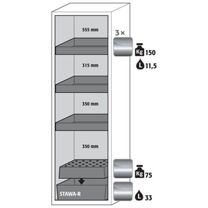 Veilige opslag van ontvlambare gevaarlijke stoffen in werkruimtes conform de wettelijke voorschriften, Functie - constructie: Robuust en duurzaam: stabiele buitenbehuizing van gepoedercoat fijn plaatstaal, 3-voudige deurophanging, volledig sluitmechaniek en veiligheidselementen ter bescherming tegen corrosie buiten de opslagruimte gemonteerd, Ruimtebesparende vouwdeur: kleine benodigde ruimte voor de kast bij geopende deur, Betrouwbaar en veilig: de deur klikt vast in de standaard gemonteerde deurvastzetinrichting voor het veilig plaatsen en uitnemen van emballage, Geen toegang voor onbevoegden: deur afsluitbaar met profielcilinder (geschikt voor centraal deursluitsysteem), Gemakkelijk te plaatsen: stelvoeten voor het compenseren van kleinere oneffenheden in de vloer (tot 10 mm), Be- en ontluchting: geïntegreerd beluchtings- en ventilatiesysteem voor aansluiting (NW 75) op een mechanische afzuiginstallatie