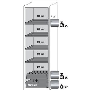 Veilige opslag, voldoet aan de geldende regelgeving voor gevaarlijke, ontvlambare producten in werkruimtes Robuust en duurzaam: Stevige constructie aan de buitenzijde van brandwerende platen met een coating van melaminehars 3 bevestigingsscharnieren per deur volledig sluitmechanisme en beveiligingselementen ter bescherming tegen corrosie, gemonteerd buiten de opslagruimte hoogwaardige deur, krasbestendig, met gestructureerd oppervlak met epoxy-coating Ergonomisch: de deur blijft in de stand staan bij het openen, automatische sluiting in geval van brand Gecontroleerd gebruik: vergrendelbare deur, compatibel met centrale vergrendeling Eenvoudig transport: geïntegreerde transportsokkel, eenvoudig afgewerkte plint of plint met 4 nivelleringsvoeten optioneel beschikbaar Beluchting en ontluchting: ingebouwd beluchtings- en ventilatiesysteem voor aansluiting (diameter 75 mm) op een technisch luchtafvoersysteem Getest en gecertificeerd conform de Amerikaanse norm FM 6050