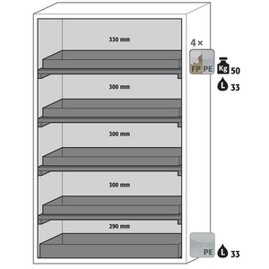 Veiligheidskast S-PHOENIX-90 S90.196.120_Asecos, Totale hoogte: 1968 mm, Totale breedte: 1196 mm, Totale hoogte (Reeks): Hoog (1500 - 2300 mm), Totale breedte (Reeks): 800 mm, Aantal legborden: 4, Voor producten: Ontvlambare stoffen, Brandveilig: 90 min, Inhoud opvangbak: 33 L, Aantal vakken: 1, Model: 4x opvanglegbord, 1 x opvangbak op de vloer (PP), Aantal deuren: 2, Kleur ombouw: Lichtgrijs, Kleur deur: Lichtgrijs, Totale diepte: 616 mm, Nuttige breedte: 1050 mm, Nuttige diepte: 524 mm, Nuttige hoogte: 1742 mm, Materiaal: Staal, Gewicht: 510.488 kg, RAL: 7035, Special Covid-19: nee
