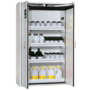 Veilige opslag, voldoet aan de geldende regelgeving voor gevaarlijke, ontvlambare producten in werkruimtes Robuust en duurzaam: Stevige constructie aan de buitenzijde van brandwerende platen met een coating van melaminehars 3 bevestigingsscharnieren per deur volledig sluitmechanisme en beveiligingselementen ter bescherming tegen corrosie, gemonteerd buiten de opslagruimte hoogwaardige deur, krasbestendig, met gestructureerd oppervlak met epoxy-coating Ergonomisch: de deur blijft in de stand staan bij het openen, automatische sluiting in geval van brand Gecontroleerd gebruik: vergrendelbare deur, compatibel met centrale vergrendeling Eenvoudig transport: geïntegreerde transportsokkel, eenvoudig afgewerkte plint of plint met 4 nivelleringsvoeten optioneel beschikbaar Beluchting en ontluchting: ingebouwd beluchtings- en ventilatiesysteem voor aansluiting (diameter 75 mm) op een technisch luchtafvoersysteem Getest en gecertificeerd conform de Amerikaanse norm FM 6050