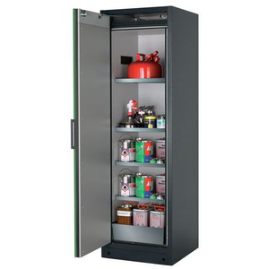 Veiligheidskast Q-PEGASUS-90 Q90.195.060 grijs/groen_Asecos, Totale hoogte: 1953 mm, Totale breedte: 599 mm, Totale hoogte (Reeks): Hoog (1500 - 2300 mm), Totale breedte (Reeks): 500 - 800 mm, Aantal legborden: 4, Voor producten: Ontvlambare stoffen, Brandveilig: 90 min, Inhoud opvangbak: 22 L, Aantal vakken: 1, Model: 4x legbord, 1x rooster, 1x opvangbak op de vloer (roestvrij staal), Aantal deuren: 1, Kleur ombouw: Antraciet, Kleur deur: Groen, Totale diepte: 615 mm, Nuttige breedte: 450 mm, Nuttige diepte: 522 mm, Nuttige hoogte: 1647 mm, Materiaal: Staal, Gewicht: 318.28 kg, RAL: 7016, Special Covid-19: nee