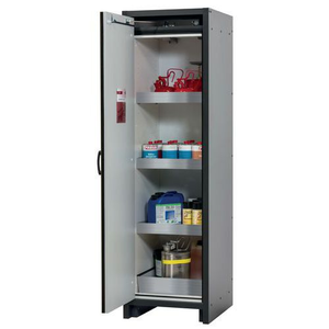 Veilige opslag, voldoet aan de geldende regelgeving voor gevaarlijke, ontvlambare producten in werkruimtes Robuust en duurzaam: stevige constructie aan de buitenzijde van brandwerende platen met een coating van melaminehars 3 bevestigingsscharnieren per deur, volledig sluitmechanisme en beveiligingselementen ter bescherming tegen corrosie, gemonteerd buiten de opslagruimte hoogwaardige deur, krasbestendig, met gestructureerd oppervlak met epoxy-coating Ergonomisch: de deur blijft in de stand staan bij het openen, automatische sluiting in geval van brand Gecontroleerd gebruik: vergrendelbare deur, compatibel met centrale vergrendeling Eenvoudig transport: geïntegreerde transportsokkel, eenvoudig afgewerkte plint of plint met 4 nivelleringsvoeten optioneel beschikbaar Beluchting en ontluchting: ingebouwd beluchtings- en ventilatiesysteem voor aansluiting (diameter 75 mm) op een technisch luchtafvoersysteem Getest en gecertificeerd conform de Amerikaanse norm FM 6050 Let op: wij raden aan om naast de kast ook de plint met verstelinrichting te bestellen. Hierdoor is het mogelijk om snel en veilig kleine oneffenheden in de vloer op te vangen, zodat de kast eenvoudig en zonder veel moeite kan worden versteld. Voor de technische ventilatie van de kast adviseren wij de ventilatiebox met geïntegreerde filtratie (zonder gaten in de muren te boren of afvoerleidingen naar buiten).