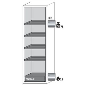 Veiligheidskast S-CLASSIC-90, Totale hoogte: 1968 mm, Totale breedte: 596 mm, Totale hoogte (Reeks): Hoog (1500 - 2300 mm), Totale breedte (Reeks): 500 - 800 mm, Aantal legborden: 4, Voor producten: Ontvlambare stoffen, Brandveilig: 90 min, Inhoud opvangbak: 22 L, Aantal vakken: 1, Model: 4x legbord, 1x opvangbak op de vloer (roestvrij staal), Aantal deuren: 1, Kleur ombouw: Wit, Kleur deur: Wit, Totale diepte: 616 mm, Nuttige breedte: 450 m, Nuttige diepte: 524 mm, Nuttige hoogte: 1742 mm, Materiaal: Staal, Gewicht: 289.165 kg, RAL: 9016, Special Covid-19: nee