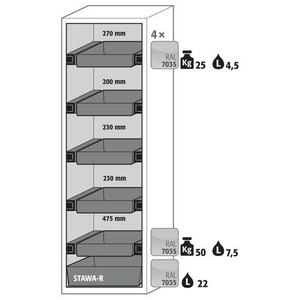 Veiligheidskast S-CLASSIC-90, Totale hoogte: 1968 mm, Totale breedte: 596 mm, Totale hoogte (Reeks): Hoog (1500 - 2300 mm), Totale breedte (Reeks): 500 - 800 mm, Aantal legborden: 0, Voor producten: Ontvlambare stoffen, Brandveilig: 90 min, Inhoud opvangbak: 22 L, Aantal vakken: 1, Model: 4x lade, 1x lade (afvoer), 1x opvangbak op de vloer (plaatstaal met epoxy-coating), Aantal deuren: 1, Kleur ombouw: Wit, Kleur deur: Wit, Totale diepte: 616 mm, Nuttige breedte: 450 m, Nuttige diepte: 524 mm, Nuttige hoogte: 1742 mm, Materiaal: Staal, Gewicht: 316.165 kg, RAL: 9016, Special Covid-19: nee