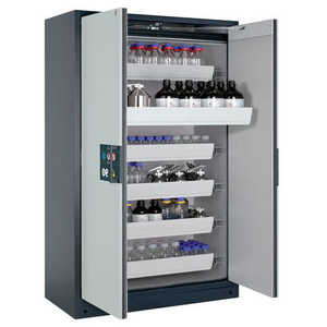 Veilige opslag, voldoet aan de geldende regelgeving voor gevaarlijke, ontvlambare producten in werkruimtes Robuust en duurzaam: Stevige constructie aan de buitenzijde van brandwerende platen met een coating van melaminehars 3 bevestigingsscharnieren per deur volledig sluitmechanisme en beveiligingselementen ter bescherming tegen corrosie, gemonteerd buiten de opslagruimte hoogwaardige deur, Krasbestendig, met gestructureerd oppervlak met epoxy-coating Ergonomisch: de deur blijft in de stand staan bij het openen, automatische sluiting in geval van brand Gecontroleerd gebruik: vergrendelbare deur, compatibel met centrale vergrendeling Eenvoudig transport: geïntegreerde transportsokkel, eenvoudig afgewerkte plint of plint met 4 nivelleringsvoeten optioneel beschikbaar Beluchting en ontluchting: ingebouwd beluchtings- en ventilatiesysteem voor aansluiting (diameter 75 mm) op een technisch luchtafvoersysteem Getest en gecertificeerd conform de Amerikaanse norm FM 6050 Let op: voor de technische ventilatie van de kast adviseren wij de ventilatiebox met geïntegreerde filtratie (zonder gaten in de muren te boren of afvoerleidingen naar buiten). We raden ook de plint aan om de geïntegreerde transportbasis goed af te sluiten.