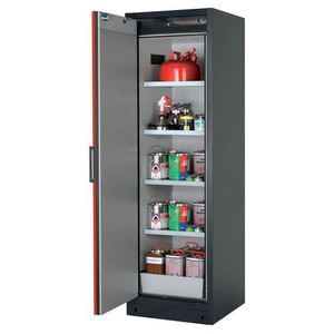 Veiligheidskast Q-CLASSIC-90 Q90.195.060 grijs/rood_Asecos, Totale hoogte: 1953 mm, Totale breedte: 599 mm, Totale hoogte (Reeks): Hoog (1500 - 2300 mm), Totale breedte (Reeks): 500 - 800 mm, Aantal legborden: 4, Voor producten: Ontvlambare stoffen, Brandveilig: 90 min, Inhoud opvangbak: 22 L, Aantal vakken: 1, Model: 4x legbord, 1x rooster, 1x opvangbak op de vloer (plaatstaal met epoxy-coating), Aantal deuren: 1, Kleur ombouw: Antraciet, Kleur deur: Rood, Totale diepte: 615 mm, Nuttige breedte: 450 mm, Nuttige diepte: 522 mm, Nuttige hoogte: 1647 mm, Materiaal: Staal, Gewicht: 321.78 kg, RAL: 7016, Special Covid-19: nee