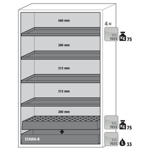 Veilige opslag, voldoet aan de geldende regelgeving voor gevaarlijke, ontvlambare producten in werkruimtes Robuust en duurzaam: Stevige constructie aan de buitenzijde van brandwerende platen met een coating van melaminehars 3 bevestigingsscharnieren per deur volledig sluitmechanisme en beveiligingselementen ter bescherming tegen corrosie, gemonteerd buiten de opslagruimte hoogwaardige deur, krasbestendig, met gestructureerd oppervlak met epoxy-coating Ergonomisch: de deur blijft in de stand staan bij het openen, automatische sluiting in geval van brand Gecontroleerd gebruik: vergrendelbare deur, compatibel met centrale vergrendeling Eenvoudig transport: geïntegreerde transportsokkel, eenvoudig afgewerkte plint of plint met 4 nivelleringsvoeten optioneel beschikbaar Beluchting en ontluchting: ingebouwd beluchtings- en ventilatiesysteem voor aansluiting (diameter 75 mm) op een technisch luchtafvoersysteem Getest en gecertificeerd conform de Amerikaanse norm FM 6050