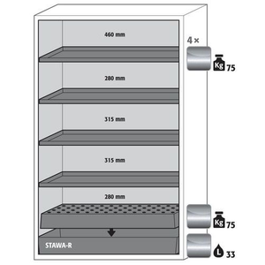 Veilige opslag, voldoet aan de geldende regelgeving voor gevaarlijke, ontvlambare producten in werkruimtes Robuust en duurzaam: Stevige constructie aan de buitenzijde van brandwerende platen met een coating van melaminehars 3 bevestigingsscharnieren per deur volledig sluitmechanisme en beveiligingselementen ter bescherming tegen corrosie, gemonteerd buiten de opslagruimte hoogwaardige deur, krasbestendig, met gestructureerd oppervlak met epoxy-coating Ergonomisch: de deur blijft in de stand staan bij het openen, automatische sluiting in geval van brand Gecontroleerd gebruik: vergrendelbare deur, compatibel met centrale vergrendeling Eenvoudig transport: geïntegreerde transportsokkel, eenvoudig afgewerkte plint of plint met 4 nivelleringsvoeten optioneel beschikbaar Beluchting en ontluchting: ingebouwd beluchtings- en ventilatiesysteem voor aansluiting (diameter 75 mm) op een technisch luchtafvoersysteem Getest en gecertificeerd conform de Amerikaanse norm FM 6050