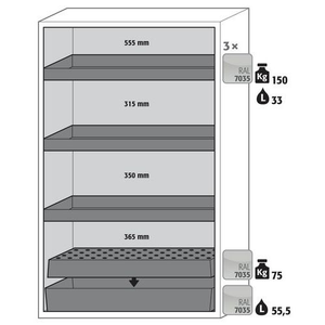 Veiligheidskast S-CLASSIC-90, Totale hoogte: 1968 mm, Totale breedte: 1196 mm, Totale hoogte (Reeks): Hoog (1500 - 2300 mm), Totale breedte (Reeks): 800 mm, Aantal legborden: 3, Voor producten: Ontvlambare stoffen, Brandveilig: 90 min, Inhoud opvangbak: 55 L, Aantal vakken: 1, Model: 3x opvanglegbord, 1x rooster, 1x opvangbak op de vloer (plaatstaal met epoxy-coating), Aantal deuren: 2, Kleur ombouw: Wit, Kleur deur: Wit, Totale diepte: 616 mm, Nuttige breedte: 1050 m, Nuttige diepte: 524 mm, Nuttige hoogte: 1742 mm, Materiaal: Staal, Gewicht: 467.988 kg, RAL: 9016, Special Covid-19: nee