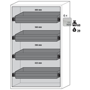 Veiligheidskast S-CLASSIC-90 S90.196.120 geel_Asecos, Totale hoogte: 1968 mm, Totale breedte: 1196 mm, Totale hoogte (Reeks): Hoog (1500 - 2300 mm), Totale breedte (Reeks): 800 mm, Aantal legborden: 0, Voor producten: Ontvlambare stoffen, Brandveilig: 90 min, Inhoud opvangbak: 0 L, Aantal vakken: 1, Model: 4x lade (plaatstaal met epoxy-coating), Aantal deuren: 2, Kleur ombouw: Lichtgrijs, Kleur deur: Lichtgrijs, Totale diepte: 616 mm, Nuttige breedte: 1050 mm, Nuttige diepte: 524 mm, Nuttige hoogte: 1742 mm, Gewicht: 492.488 kg, RAL: 7035, Special Covid-19: nee