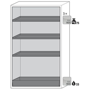 Veilige opslag, voldoet aan de geldende regelgeving voor gevaarlijke, ontvlambare producten in werkruimtes Robuust en duurzaam: Stevige constructie aan de buitenzijde van brandwerende platen met een coating van melaminehars 3 bevestigingsscharnieren per deur volledig sluitmechanisme en beveiligingselementen ter bescherming tegen corrosie, gemonteerd buiten de opslagruimte hoogwaardige deur, krasbestendig, met gestructureerd oppervlak met epoxy-coating Ergonomisch: de deur blijft in de stand staan bij het openen, automatische sluiting in geval van brand Gecontroleerd gebruik: vergrendelbare deur, compatibel met centrale vergrendeling Eenvoudig transport: geïntegreerde transportsokkel, eenvoudig afgewerkte plint of plint met 4 nivelleringsvoeten optioneel beschikbaar Beluchting en ontluchting: ingebouwd beluchtings- en ventilatiesysteem voor aansluiting (diameter 75 mm) op een technisch luchtafvoersysteem Getest en gecertificeerd conform de Amerikaanse norm FM 6050