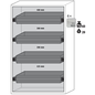 Veilige opslag, voldoet aan de geldende regelgeving voor gevaarlijke, ontvlambare producten in werkruimtes Robuust en duurzaam: Stevige constructie aan de buitenzijde van brandwerende platen met een coating van melaminehars 3 bevestigingsscharnieren per deur volledig sluitmechanisme en beveiligingselementen ter bescherming tegen corrosie, gemonteerd buiten de opslagruimte hoogwaardige deur, krasbestendig, met gestructureerd oppervlak met epoxy-coating Ergonomisch: de deur blijft in de stand staan bij het openen, automatische sluiting in geval van brand Gecontroleerd gebruik: vergrendelbare deur, compatibel met centrale vergrendeling Eenvoudig transport: geïntegreerde transportsokkel, eenvoudig afgewerkte plint of plint met 4 nivelleringsvoeten optioneel beschikbaar Beluchting en ontluchting: ingebouwd beluchtings- en ventilatiesysteem voor aansluiting (diameter 75 mm) op een technisch luchtafvoersysteem Getest en gecertificeerd conform de Amerikaanse norm FM 6050