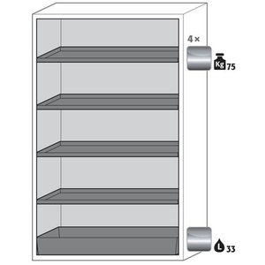 Veilige opslag, voldoet aan de geldende regelgeving voor gevaarlijke, ontvlambare producten in werkruimtes Robuust en duurzaam: Stevige constructie aan de buitenzijde van brandwerende platen met een coating van melaminehars 3 bevestigingsscharnieren per deur volledig sluitmechanisme en beveiligingselementen ter bescherming tegen corrosie, gemonteerd buiten de opslagruimte hoogwaardige deur, krasbestendig, met gestructureerd oppervlak met epoxy-coating Ergonomisch: de deur blijft in de stand staan bij het openen, automatische sluiting in geval van brand Gecontroleerd gebruik: vergrendelbare deur, compatibel met centrale vergrendeling Eenvoudig transport: geïntegreerde transportsokkel, eenvoudig afgewerkte plint of plint met 4 nivelleringsvoeten optioneel beschikbaar Beluchting en ontluchting: ingebouwd beluchtings- en ventilatiesysteem voor aansluiting (diameter 75 mm) op een technisch luchtafvoersysteem Getest en gecertificeerd conform de Amerikaanse norm FM 6050 Let op: voor de technische ventilatie van de kast adviseren wij de ventilatiebox met geïntegreerde filtratie (zonder gaten in de muren te boren of afvoerleidingen naar buiten).