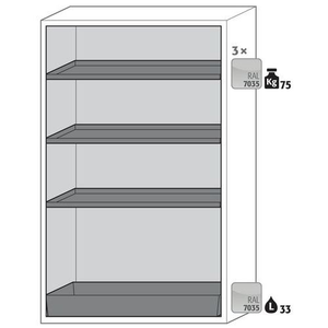 Veiligheidskast S-PHOENIX Vol.2-90 S90.196.120_Asecos, Totale hoogte: 1968 mm, Totale breedte: 1196 mm, Totale hoogte (Reeks): Hoog (1500 - 2300 mm), Totale breedte (Reeks): 800 mm, Aantal legborden: 3, Voor producten: Ontvlambare stoffen, Brandveilig: 90 min, Inhoud opvangbak: 33 L, Aantal vakken: 1, Model: 3x legbord, 1x opvangbak op de vloer (plaatstaal met epoxy-coating), Aantal deuren: 2, Kleur ombouw: Lichtgrijs, Kleur deur: Lichtgrijs, Totale diepte: 616 mm, Nuttige breedte: 1050 mm, Nuttige diepte: 524 mm, Nuttige hoogte: 1742 mm, Materiaal: Staal, Gewicht: 468.988 kg, RAL: 7035, Special Covid-19: nee