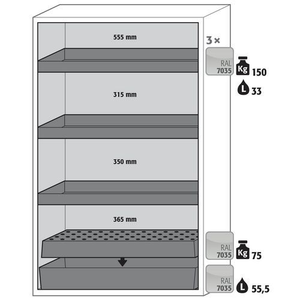 Veiligheidskast S-PHOENIX Vol.2-90 S90.196.120_Asecos, Totale hoogte: 1968 mm, Totale breedte: 1196 mm, Totale hoogte (Reeks): Hoog (1500 - 2300 mm), Totale breedte (Reeks): 800 mm, Aantal legborden: 3, Voor producten: Ontvlambare stoffen, Brandveilig: 90 min, Inhoud opvangbak: 55 L, Aantal vakken: 1, Model: 3x opvanglegbord, 1 x rooster, 1 x opvangbak op de vloer (plaatstaal met epoxy-coating), Aantal deuren: 2, Kleur ombouw: Lichtgrijs, Kleur deur: Lichtgrijs, Totale diepte: 616 mm, Nuttige breedte: 1050 mm, Nuttige diepte: 524 mm, Nuttige hoogte: 1742 mm, Materiaal: Staal, Gewicht: 480.988 kg, RAL: 7035, Special Covid-19: nee