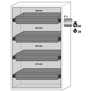 Veiligheidskast S-PHOENIX Vol.2-90 S90.196.120_Asecos, Totale hoogte: 1968 mm, Totale breedte: 1196 mm, Totale hoogte (Reeks): Hoog (1500 - 2300 mm), Totale breedte (Reeks): 800 mm, Aantal legborden: 0, Voor producten: Ontvlambare stoffen, Brandveilig: 90 min, Inhoud opvangbak: 0 L, Aantal vakken: 1, Model: 4x lade (roestvrij staal), Aantal deuren: 2, Kleur ombouw: Lichtgrijs, Kleur deur: Lichtgrijs, Totale diepte: 616 mm, Nuttige breedte: 1050 mm, Nuttige diepte: 524 mm, Nuttige hoogte: 1742 mm, Gewicht: 505.488 kg, RAL: 7035, Special Covid-19: nee