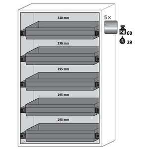 Veiligheidskast S-PHOENIX Vol.2-90 S90.196.120_Asecos, Totale hoogte: 1968 mm, Totale breedte: 1196 mm, Totale hoogte (Reeks): Hoog (1500 - 2300 mm), Totale breedte (Reeks): 800 mm, Aantal legborden: 0, Voor producten: Ontvlambare stoffen, Brandveilig: 90 min, Inhoud opvangbak: 0 L, Aantal vakken: 1, Model: 5x lade (roestvrij staal), Aantal deuren: 2, Kleur ombouw: Lichtgrijs, Kleur deur: Lichtgrijs, Totale diepte: 616 mm, Nuttige breedte: 1050 mm, Nuttige diepte: 524 mm, Nuttige hoogte: 1742 mm, Gewicht: 521.488 kg, RAL: 7035, Special Covid-19: nee