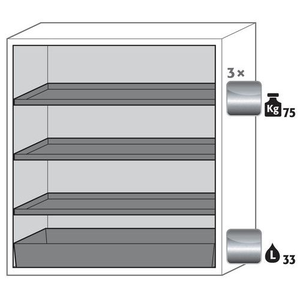 Veilige opslag, voldoet aan de geldende regelgeving voor gevaarlijke, ontvlambare producten in werkruimtes Robuust en duurzaam: Stevige constructie aan de buitenzijde van brandwerende platen met een coating van melaminehars 3 bevestigingsscharnieren per deur volledig sluitmechanisme en beveiligingselementen ter bescherming tegen corrosie, gemonteerd buiten de opslagruimte hoogwaardige deur, krasbestendig, met gestructureerd oppervlak met epoxy-coating Ergonomisch: de deur blijft in de stand staan bij het openen, automatische sluiting in geval van brand Gecontroleerd gebruik: vergrendelbare deur, compatibel met centrale vergrendeling Eenvoudig transport: geïntegreerde transportsokkel, eenvoudig afgewerkte plint of plint met 4 nivelleringsvoeten optioneel beschikbaar Beluchting en ontluchting: ingebouwd beluchtings- en ventilatiesysteem voor aansluiting (diameter 75 mm) op een technisch luchtafvoersysteem Getest en gecertificeerd conform de Amerikaanse norm FM 6050 Let op: voor de technische ventilatie van de kast adviseren wij de ventilatiebox met geïntegreerde filtratie (zonder gaten in de muren te boren of afvoerleidingen naar buiten).