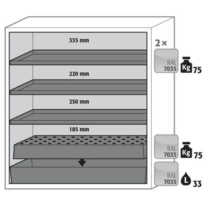 Veilige opslag, voldoet aan de geldende regelgeving voor gevaarlijke, ontvlambare producten in werkruimtes Robuust en duurzaam: Stevige constructie aan de buitenzijde van brandwerende platen met een coating van melaminehars 3 bevestigingsscharnieren per deur volledig sluitmechanisme en beveiligingselementen ter bescherming tegen corrosie, gemonteerd buiten de opslagruimte hoogwaardige deur, krasbestendig, met gestructureerd oppervlak met epoxy-coating Ergonomisch: de deur blijft in de stand staan bij het openen, automatische sluiting in geval van brand Gecontroleerd gebruik: vergrendelbare deur, compatibel met centrale vergrendeling Eenvoudig transport: geïntegreerde transportsokkel, eenvoudig afgewerkte plint of plint met 4 nivelleringsvoeten optioneel beschikbaar Beluchting en ontluchting: ingebouwd beluchtings- en ventilatiesysteem voor aansluiting (diameter 75 mm) op een technisch luchtafvoersysteem Getest en gecertificeerd conform de Amerikaanse norm FM 6050 Let op: voor de technische ventilatie van de kast adviseren wij de ventilatiebox met geïntegreerde filtratie (zonder gaten in de muren te boren of afvoerleidingen naar buiten).