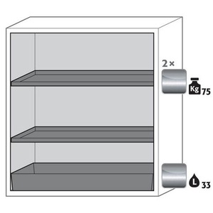 Veilige opslag, voldoet aan de geldende regelgeving voor gevaarlijke, ontvlambare producten in werkruimtes Robuust en duurzaam: Stevige constructie aan de buitenzijde van brandwerende platen met een coating van melaminehars 3 bevestigingsscharnieren per deur volledig sluitmechanisme en beveiligingselementen ter bescherming tegen corrosie, gemonteerd buiten de opslagruimte hoogwaardige deur, krasbestendig, met gestructureerd oppervlak met epoxy-coating Ergonomisch: de deur blijft in de stand staan bij het openen, automatische sluiting in geval van brand Gecontroleerd gebruik: vergrendelbare deur, compatibel met centrale vergrendeling Eenvoudig transport: geïntegreerde transportsokkel, eenvoudig afgewerkte plint of plint met 4 nivelleringsvoeten optioneel beschikbaar Beluchting en ontluchting: ingebouwd beluchtings- en ventilatiesysteem voor aansluiting (diameter 75 mm) op een technisch luchtafvoersysteem Getest en gecertificeerd conform de Amerikaanse norm FM 6050 Let op: voor de technische ventilatie van de kast adviseren wij de ventilatiebox met geïntegreerde filtratie (zonder gaten in de muren te boren of afvoerleidingen naar buiten).