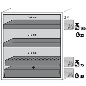 Veilige opslag, voldoet aan de geldende regelgeving voor gevaarlijke, ontvlambare producten in werkruimtes Robuust en duurzaam: Stevige constructie aan de buitenzijde van brandwerende platen met een coating van melaminehars 3 bevestigingsscharnieren per deur volledig sluitmechanisme en beveiligingselementen ter bescherming tegen corrosie, gemonteerd buiten de opslagruimte hoogwaardige deur, krasbestendig, met gestructureerd oppervlak met epoxy-coating Ergonomisch: de deur blijft in de stand staan bij het openen, automatische sluiting in geval van brand Gecontroleerd gebruik: vergrendelbare deur, compatibel met centrale vergrendeling Eenvoudig transport: geïntegreerde transportsokkel, eenvoudig afgewerkte plint of plint met 4 nivelleringsvoeten optioneel beschikbaar Beluchting en ontluchting: ingebouwd beluchtings- en ventilatiesysteem voor aansluiting (diameter 75 mm) op een technisch luchtafvoersysteem Getest en gecertificeerd conform de Amerikaanse norm FM 6050