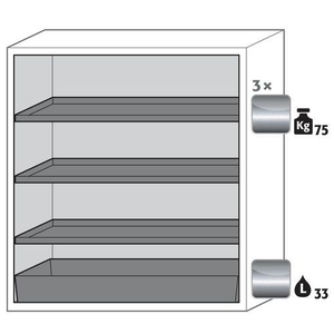 Veilige opslag, voldoet aan de geldende regelgeving voor gevaarlijke, ontvlambare producten in werkruimtes Robuust en duurzaam: Stevige constructie aan de buitenzijde van brandwerende platen met een coating van melaminehars 3 bevestigingsscharnieren per deur volledig sluitmechanisme en beveiligingselementen ter bescherming tegen corrosie, gemonteerd buiten de opslagruimte hoogwaardige deur, krasbestendig, met gestructureerd oppervlak met epoxy-coating Ergonomisch: de deur blijft in de stand staan bij het openen, automatische sluiting in geval van brand Gecontroleerd gebruik: vergrendelbare deur, compatibel met centrale vergrendeling Eenvoudig transport: geïntegreerde transportsokkel, eenvoudig afgewerkte plint of plint met 4 nivelleringsvoeten optioneel beschikbaar Beluchting en ontluchting: ingebouwd beluchtings- en ventilatiesysteem voor aansluiting (diameter 75 mm) op een technisch luchtafvoersysteem Getest en gecertificeerd conform de Amerikaanse norm FM 6050