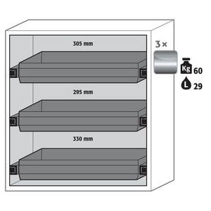 Veilige opslag, voldoet aan de geldende regelgeving voor gevaarlijke, ontvlambare producten in werkruimtes Robuust en duurzaam: Stevige constructie aan de buitenzijde van brandwerende platen met een coating van melaminehars 3 bevestigingsscharnieren per deur volledig sluitmechanisme en beveiligingselementen ter bescherming tegen corrosie, gemonteerd buiten de opslagruimte hoogwaardige deur, krasbestendig, met gestructureerd oppervlak met epoxy-coating Ergonomisch: de deur blijft in de stand staan bij het openen, automatische sluiting in geval van brand Gecontroleerd gebruik: vergrendelbare deur, compatibel met centrale vergrendeling Eenvoudig transport: geïntegreerde transportsokkel, eenvoudig afgewerkte plint of plint met 4 nivelleringsvoeten optioneel beschikbaar Beluchting en ontluchting: ingebouwd beluchtings- en ventilatiesysteem voor aansluiting (diameter 75 mm) op een technisch luchtafvoersysteem Getest en gecertificeerd conform de Amerikaanse norm FM 6050