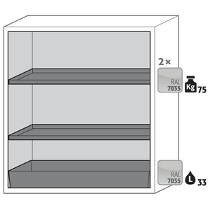 Veiligheidskast S-PEGASUS-90_Asecos, Totale hoogte: 1298 mm, Totale breedte: 1196 mm, Totale hoogte (Reeks): Medium high (900 - 1400 mm), Totale breedte (Reeks): 800 mm, Aantal legborden: 2, Voor producten: Ontvlambare stoffen, Brandveilig: 90 min, Inhoud opvangbak: 33 L, Aantal vakken: 1, Model: 2x legbord, 1x opvangbak op de vloer (plaatstaal met epoxy-coating), Aantal deuren: 2, Kleur ombouw: Lichtgrijs, Kleur deur: Lichtgrijs, Totale diepte: 616 mm, Nuttige breedte: 1050 mm, Nuttige diepte: 524 mm, Nuttige hoogte: 1072 mm, Materiaal: Staal, Gewicht: 343.488 kg, RAL: 7035, Special Covid-19: nee