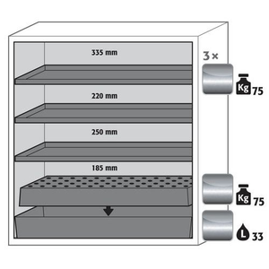 Veilige opslag, voldoet aan de geldende regelgeving voor gevaarlijke, ontvlambare producten in werkruimtes Functie/constructie: Robuust en duurzaam: stevige stalen constructie aan de buitenkant met epoxy-coating 3 bevestigingsscharnieren per deur, volledig sluitmechanisme en beveiligingselementen ter bescherming tegen corrosie, gemonteerd buiten de opslagruimte Comfortabel: automatisch deursluitsysteem, deuren kunnen in geopende stand worden gehouden. Veilige opslag van containers Altijd gesloten: automatisch deursluitsysteem (TSA) sluit de geblokkeerde deur na 60 seconde, geluidsalarm en visueel alarm voordat de deur sluit Gecontroleerd gebruik: vergrendelbare deur, compatibel met centrale vergrendeling Eenvoudige installatie: geïntegreerde verstelbare poten Beluchting en ontluchting: ingebouwd beluchtings- en ventilatiesysteem voor aansluiting (diameter 75 mm) op een technisch luchtafvoersysteem Let op: voor de technische ventilatie van de kast adviseren wij de ventilatiebox met geïntegreerde filtratie (zonder gaten in de muren te boren of afvoerleidingen naar buiten).