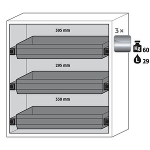 Veiligheidskast S-PEGASUS-90_Asecos, Totale hoogte: 1298 mm, Totale breedte: 1196 mm, Totale hoogte (Reeks): Medium high (900 - 1400 mm), Totale breedte (Reeks): 800 mm, Aantal legborden: 0, Voor producten: Ontvlambare stoffen, Brandveilig: 90 min, Inhoud opvangbak: 0 L, Aantal vakken: 1, Model: 3x lade (roestvrij staal), Aantal deuren: 2, Kleur ombouw: Lichtgrijs, Kleur deur: Lichtgrijs, Totale diepte: 616 mm, Nuttige breedte: 1050 mm, Nuttige diepte: 524 mm, Nuttige hoogte: 1072 mm, Gewicht: 370.488 kg, RAL: 7035, Special Covid-19: nee