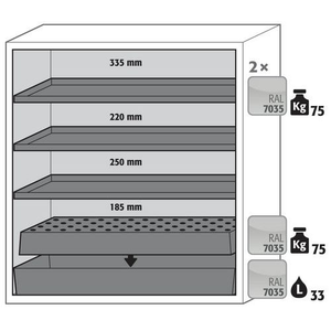 Veilige opslag, voldoet aan de geldende regelgeving voor gevaarlijke, ontvlambare producten in werkruimtes Functie/constructie: Robuust en duurzaam: stevige stalen constructie aan de buitenkant met epoxy-coating 3 bevestigingsscharnieren per deur, volledig sluitmechanisme en beveiligingselementen ter bescherming tegen corrosie, gemonteerd buiten de opslagruimte Comfortabel: automatisch deursluitsysteem, deuren kunnen in geopende stand worden gehouden. Veilige opslag van containers Altijd gesloten: automatisch deursluitsysteem (TSA) sluit de geblokkeerde deur na 60 seconde, geluidsalarm en visueel alarm voordat de deur sluit Gecontroleerd gebruik: vergrendelbare deur, compatibel met centrale vergrendeling Eenvoudige installatie: geïntegreerde verstelbare poten Beluchting en ontluchting: ingebouwd beluchtings- en ventilatiesysteem voor aansluiting (diameter 75 mm) op een technisch luchtafvoersysteem Let op: voor de technische ventilatie van de kast adviseren wij de ventilatiebox met geïntegreerde filtratie (zonder gaten in de muren te boren of afvoerleidingen naar buiten).