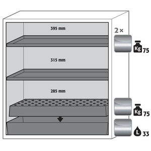 Veilige opslag, voldoet aan de geldende regelgeving voor gevaarlijke, ontvlambare producten in werkruimtes Functie/constructie: Robuust en duurzaam: stevige stalen constructie aan de buitenkant met epoxy-coating 3 bevestigingsscharnieren per deur, volledig sluitmechanisme en beveiligingselementen ter bescherming tegen corrosie, gemonteerd buiten de opslagruimte Comfortabel: automatisch deursluitsysteem, deuren kunnen in geopende stand worden gehouden. Veilige opslag van containers Altijd gesloten: automatisch deursluitsysteem (TSA) sluit de geblokkeerde deur na 60 seconde, geluidsalarm en visueel alarm voordat de deur sluit Gecontroleerd gebruik: vergrendelbare deur, compatibel met centrale vergrendeling Eenvoudige installatie: geïntegreerde verstelbare poten Beluchting en ontluchting: ingebouwd beluchtings- en ventilatiesysteem voor aansluiting (diameter 75 mm) op een technisch luchtafvoersysteem Let op: voor de technische ventilatie van de kast adviseren wij de ventilatiebox met geïntegreerde filtratie (zonder gaten in de muren te boren of afvoerleidingen naar buiten).