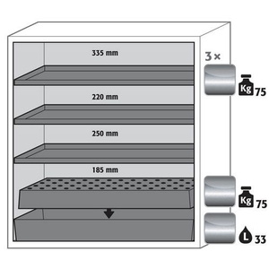 Veilige opslag, voldoet aan de geldende regelgeving voor gevaarlijke, ontvlambare producten in werkruimtes Functie/constructie: Robuust en duurzaam: stevige stalen constructie aan de buitenkant met epoxy-coating 3 bevestigingsscharnieren per deur, volledig sluitmechanisme en beveiligingselementen ter bescherming tegen corrosie, gemonteerd buiten de opslagruimte Comfortabel: automatisch deursluitsysteem, deuren kunnen in geopende stand worden gehouden. Veilige opslag van containers Altijd gesloten: automatisch deursluitsysteem (TSA) sluit de geblokkeerde deur na 60 seconde, geluidsalarm en visueel alarm voordat de deur sluit Gecontroleerd gebruik: vergrendelbare deur, compatibel met centrale vergrendeling Eenvoudige installatie: geïntegreerde verstelbare poten Beluchting en ontluchting: ingebouwd beluchtings- en ventilatiesysteem voor aansluiting (diameter 75 mm) op een technisch luchtafvoersysteem Let op: voor de technische ventilatie van de kast adviseren wij de ventilatiebox met geïntegreerde filtratie (zonder gaten in de muren te boren of afvoerleidingen naar buiten).