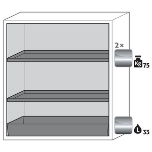 Veilige opslag, voldoet aan de geldende regelgeving voor gevaarlijke, ontvlambare producten in werkruimtes Functie/constructie: Robuust en duurzaam: stevige stalen constructie aan de buitenkant met epoxy-coating 3 bevestigingsscharnieren per deur, volledig sluitmechanisme en beveiligingselementen ter bescherming tegen corrosie, gemonteerd buiten de opslagruimte Comfortabel: automatisch deursluitsysteem, deuren kunnen in geopende stand worden gehouden. Veilige opslag van containers Altijd gesloten: automatisch deursluitsysteem (TSA) sluit de geblokkeerde deur na 60 seconde, geluidsalarm en visueel alarm voordat de deur sluit Gecontroleerd gebruik: vergrendelbare deur, compatibel met centrale vergrendeling Eenvoudige installatie: geïntegreerde verstelbare poten Beluchting en ontluchting: ingebouwd beluchtings- en ventilatiesysteem voor aansluiting (diameter 75 mm) op een technisch luchtafvoersysteem Let op: voor de technische ventilatie van de kast adviseren wij de ventilatiebox met geïntegreerde filtratie (zonder gaten in de muren te boren of afvoerleidingen naar buiten).