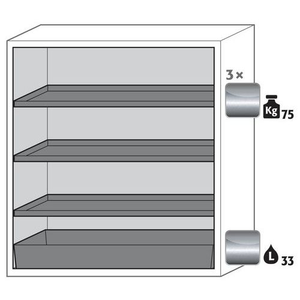 Veilige opslag, voldoet aan de geldende regelgeving voor gevaarlijke, ontvlambare producten in werkruimtes Functie/constructie: Robuust en duurzaam: stevige stalen constructie aan de buitenkant met epoxy-coating 3 bevestigingsscharnieren per deur, volledig sluitmechanisme en beveiligingselementen ter bescherming tegen corrosie, gemonteerd buiten de opslagruimte Comfortabel: automatisch deursluitsysteem, deuren kunnen in geopende stand worden gehouden. Veilige opslag van containers Altijd gesloten: automatisch deursluitsysteem (TSA) sluit de geblokkeerde deur na 60 seconde, geluidsalarm en visueel alarm voordat de deur sluit Gecontroleerd gebruik: vergrendelbare deur, compatibel met centrale vergrendeling Eenvoudige installatie: geïntegreerde verstelbare poten Beluchting en ontluchting: ingebouwd beluchtings- en ventilatiesysteem voor aansluiting (diameter 75 mm) op een technisch luchtafvoersysteem Let op: voor de technische ventilatie van de kast adviseren wij de ventilatiebox met geïntegreerde filtratie (zonder gaten in de muren te boren of afvoerleidingen naar buiten).