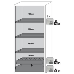 Veilige opslag, voldoet aan de geldende regelgeving voor gevaarlijke, ontvlambare producten in werkruimtes Robuust en duurzaam: Stevige constructie aan de buitenzijde van brandwerende platen met een coating van melaminehars 3 bevestigingsscharnieren per deur volledig sluitmechanisme en beveiligingselementen ter bescherming tegen corrosie, gemonteerd buiten de opslagruimte hoogwaardige deur, krasbestendig, met gestructureerd oppervlak met epoxy-coating Ergonomisch: de deur blijft in de stand staan bij het openen, automatische sluiting in geval van brand Gecontroleerd gebruik: vergrendelbare deur, compatibel met centrale vergrendeling Eenvoudig transport: geïntegreerde transportsokkel, eenvoudig afgewerkte plint of plint met 4 nivelleringsvoeten optioneel beschikbaar Beluchting en ontluchting: ingebouwd beluchtings- en ventilatiesysteem voor aansluiting (diameter 75 mm) op een technisch luchtafvoersysteem Getest en gecertificeerd conform de Amerikaanse norm FM 6050 Let op: voor de technische ventilatie van de kast adviseren wij de ventilatiebox met geïntegreerde filtratie (zonder gaten in de muren te boren of afvoerleidingen naar buiten).
