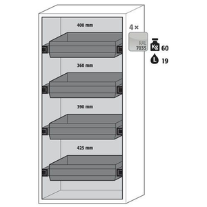 Veiligheidskast S-CLASSIC-90 S90.196.090 lichtgrijs_Asecos, Totale hoogte: 1968 mm, Totale breedte: 896 mm, Totale hoogte (Reeks): Hoog (1500 - 2300 mm), Totale breedte (Reeks): 800 mm, Aantal legborden: 0, Voor producten: Ontvlambare stoffen, Brandveilig: 90 min, Inhoud opvangbak: 0 L, Aantal vakken: 1, Model: 4x lade (plaatstaal met epoxy-coating), Aantal deuren: 2, Kleur ombouw: Lichtgrijs, Kleur deur: Lichtgrijs, Totale diepte: 616 mm, Nuttige breedte: 750 mm, Nuttige diepte: 524 mm, Nuttige hoogte: 1742 mm, Max. belasting: 600 kg, Materiaal: Staal, Gewicht: 406.608 kg, RAL: 7035, Special Covid-19: nee, CLP - Ontvlambare stoffen: ja